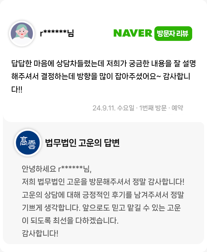 법률 상담은 얼굴을 마주하고 이야기할 때 숨겨진 사실도, 말하지 못한 감정도 함께 풀어낼 수 있습니다. 당신의 이야기를 제대로 듣기 위해 고운은 방문 상담을 원칙으로 합니다 홈페이지에서 편하게 예약하실 수 있습니다.