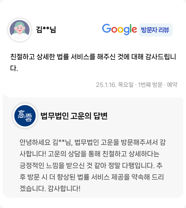 친절하고 상세한 법률 서비스를 해주신 것에 대해 감사드립니다.