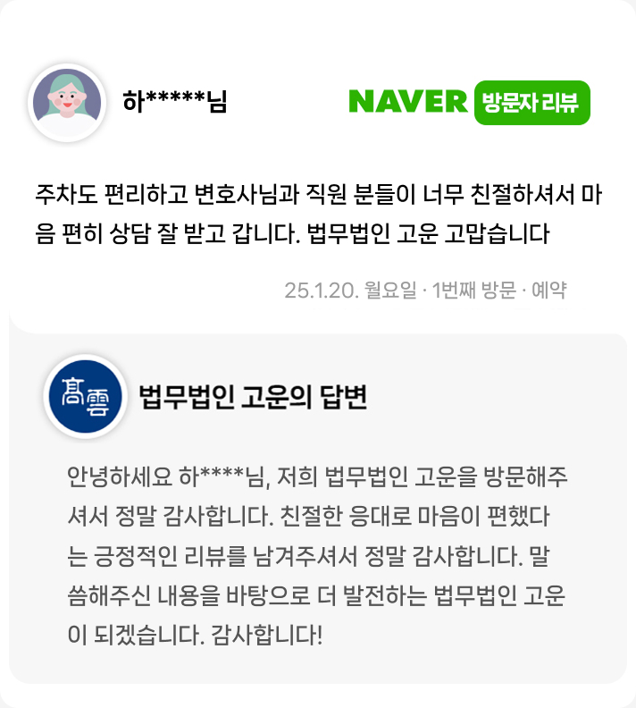 주차도 편리하고 변호사님과 직원 분들이 너무 친절하셔서 마음 편히 상담 잘 받고 갑니다.