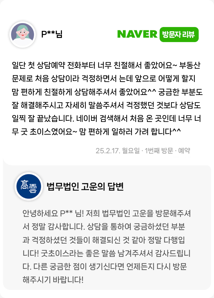 부동산 문제로 처음 상담이라 걱정하면서 왔는데 앞으로 어떻게 할지 맘 편하게 친절하게 상담해주셔서 좋았어요.