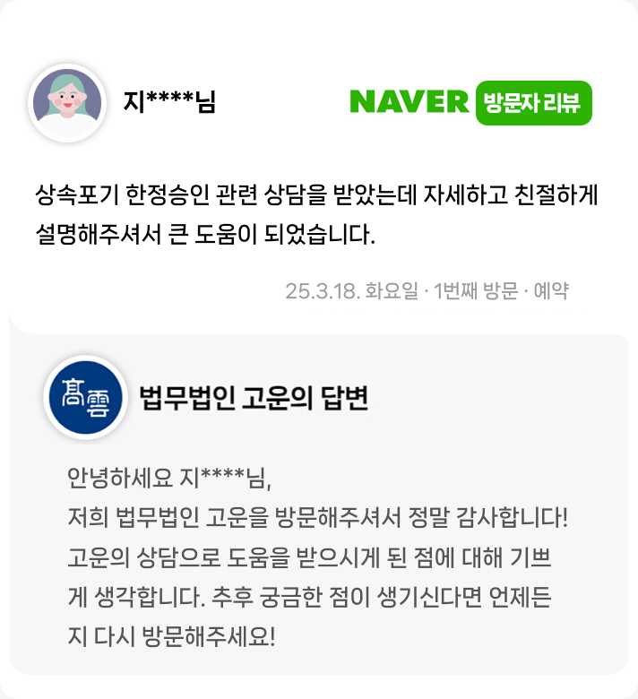 상속포기 한정승인 관련 상담을 받았는데 자세하고 친절하게 설명해주셔서 큰 도움이 되었습니다.