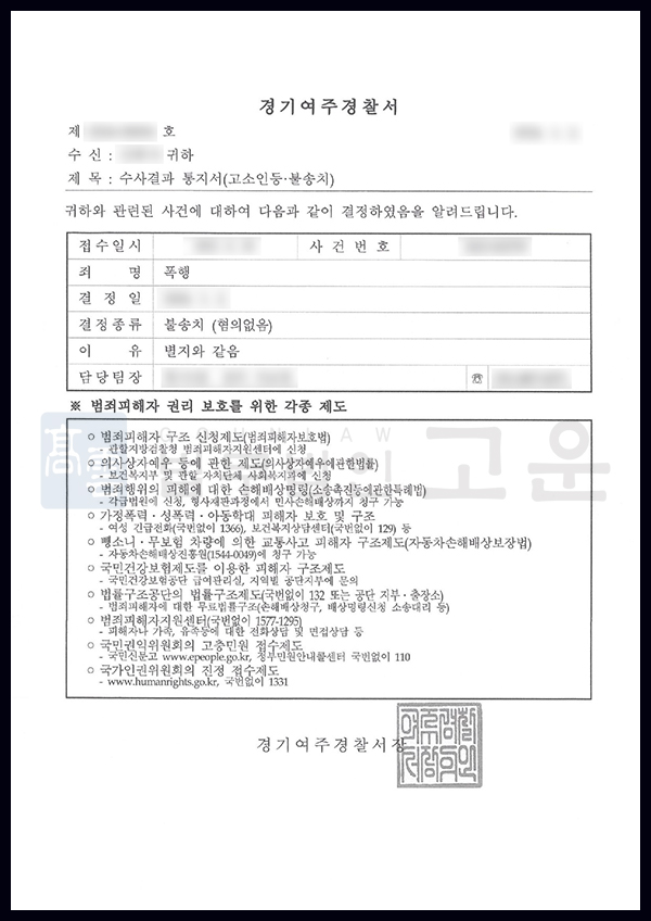 또한 폭행죄는 반의사불벌죄로, 피해자와 합의한다면 처벌이 이루어지지 않으나, A의 경우 B와 합의가 이루어지지 않았고, A의 직업 특성상 기소가 되는 것만으로도 직장에서 해고를 당할 수도 있었기 때문에 더욱 적극적인 변론을 통해 불송치 결정을 받는 것이 중요한 상황이었습니다.