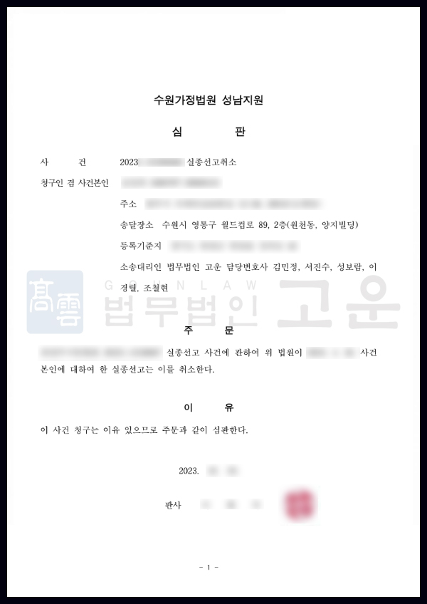 그 결과 실종 선고된 당사자와 A씨가 동일인임을 입증 하는데 성공하였고 A씨에 대한 실종선고가 취소되는 판결을 받게 되었습니다. 사망처리를 정정하여 고향 한국에서의 신분을 완전히 되찾고 일상을 온전히 보낼 수 있게 된 의뢰인은 신속하고 정확한 결과에 대해 매우 만족하였습니다.