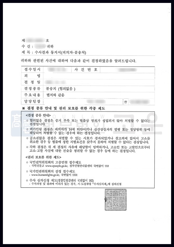 그 결과 수사기관은 법무법인 고운의 주장을 받아들여 A에게 혐의없음 처분을 내렸습니다.
