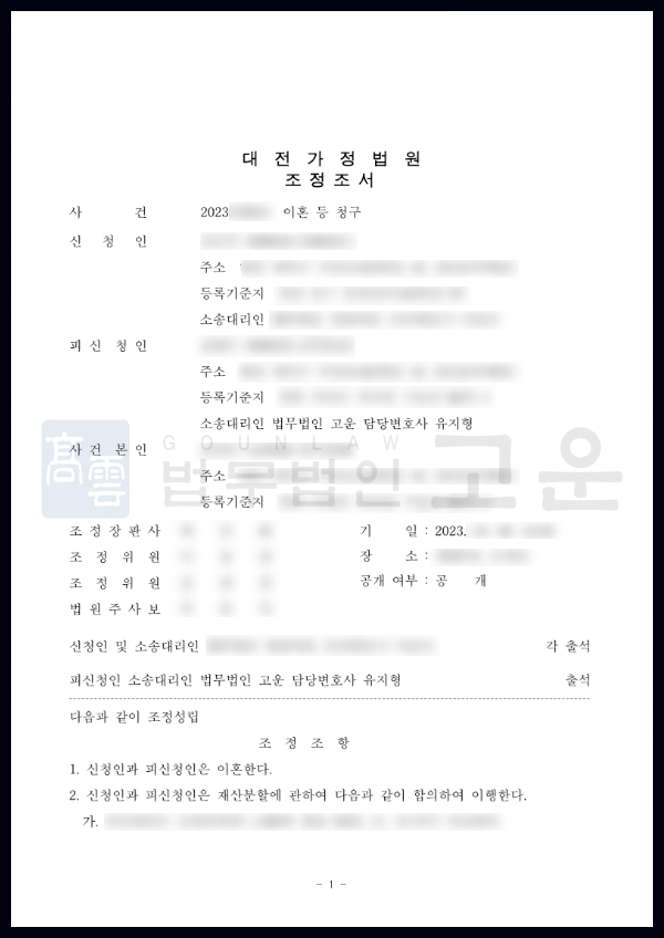 고운의 이러한 노력덕분에 결국 첫 기일에 조정이 성립되어 빠르게 이혼 절차를 마무리할 수 있었습니다. 의뢰인은 상대방과 오랜 기간 다투지 않고 상대방이 주장한 위자료를 기각하고 재산분할과 양육비를 합리적으로 해결할 수 있게 되었다는 사실에 크게 만족하였습니다.