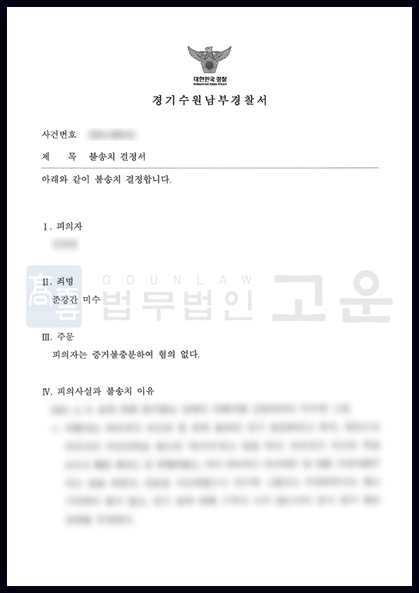 그 결과 검찰은 법무법인 고운의 주장을 상당 부분 받아들여 A에게 불송치 결정을 내렸습니다. 성범죄가 인정될 경우 중한 형사처벌을 받는 것은 물론 신상정보 등록 등 부수 처분까지 받고, 일상생활에 큰 지장이 갈 수 있었으나, 그러한 위험에서 벗어나게 되어 의미가 있는 사건이었습니다.