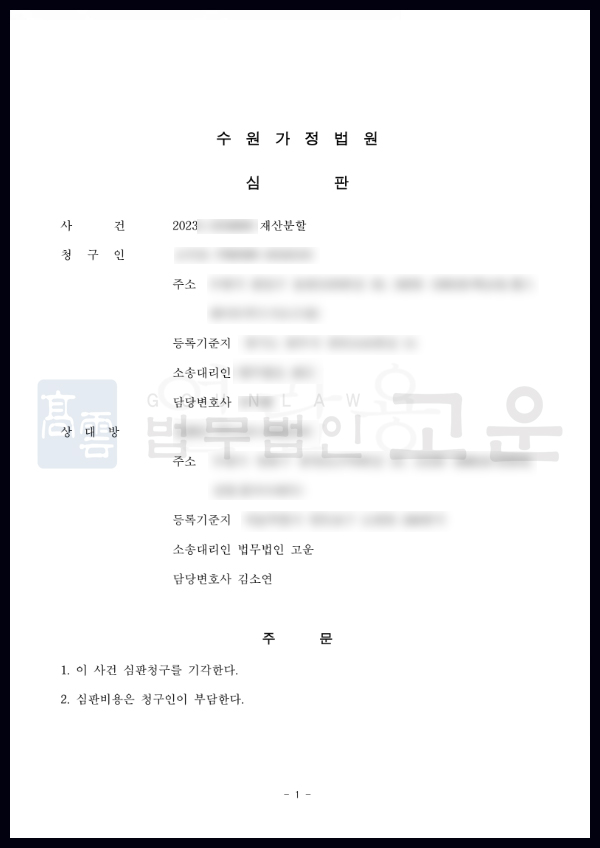 결국 법원은 고운의 주장을 받아들여 B씨의 재산분할 청구는 모두 기각되었고, 심판비용 역시 B씨가 전부 부담하게 되었습니다. 본인의 재산이 아닌 부동산에 대해 전 배우자에게 재산분할을 해줄 위기에 놓인 의뢰인이었지만, 고운의 조력으로 추가적인 재산분할을 막아내어 의미 있던 사건이었습니다.