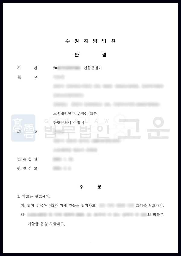 재판부는 법무법인 고운의 주장을 모두 받아들였고, B에게 해당 창고를 철거할 것은 물론, 그동안 토지를 사용한 것에 대한 차임 및 철거하기 전까지 발생하는 차임까지 지급하라는 판결을 내렸습니다.