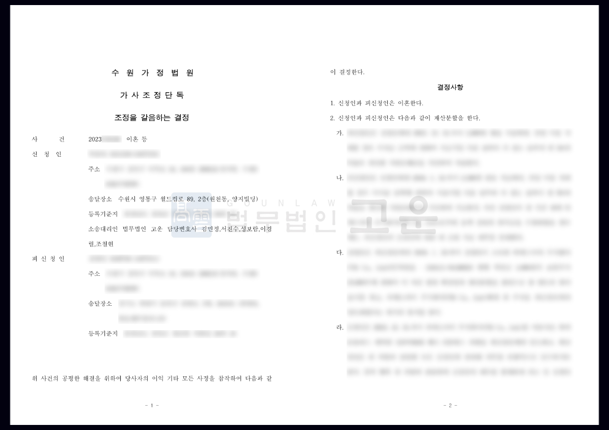 가. 법무법인 고운은 조속하고 확실하게 이혼하기를 원하는 의뢰인을 대리하여 이혼 조정 신청을 하였습니다. 이혼조정은 보다 빠르게 재판으로 이혼 절차를 마무리할 수 있으며, 협의이혼과는 달리 조정 때 결정된 내용이 판결과 동일한 효력을 갖기 때문에 향후 분쟁의 소지가 적습니다.