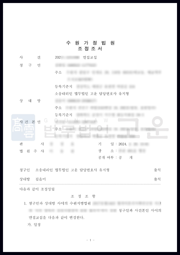 가. 법무법인 고운은 A씨와 자녀의 면접교섭 일정과 방법을 구체화하여 B씨가 이의를 제기하거나 방해를 할 수 없도록 정확하게 지정하였고, 이를 기반으로 면접교섭 변경 심판을 청구하였습니다.