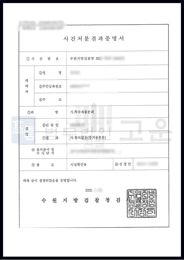 수사기관은 A가 고의적으로 타인의 재물을 손괴한 것이 아니라는 사실을 인정하여 ‘혐의 없음’ 처분을 내리고 재판단계까지 진행 없이 사건을 종결하였습니다.