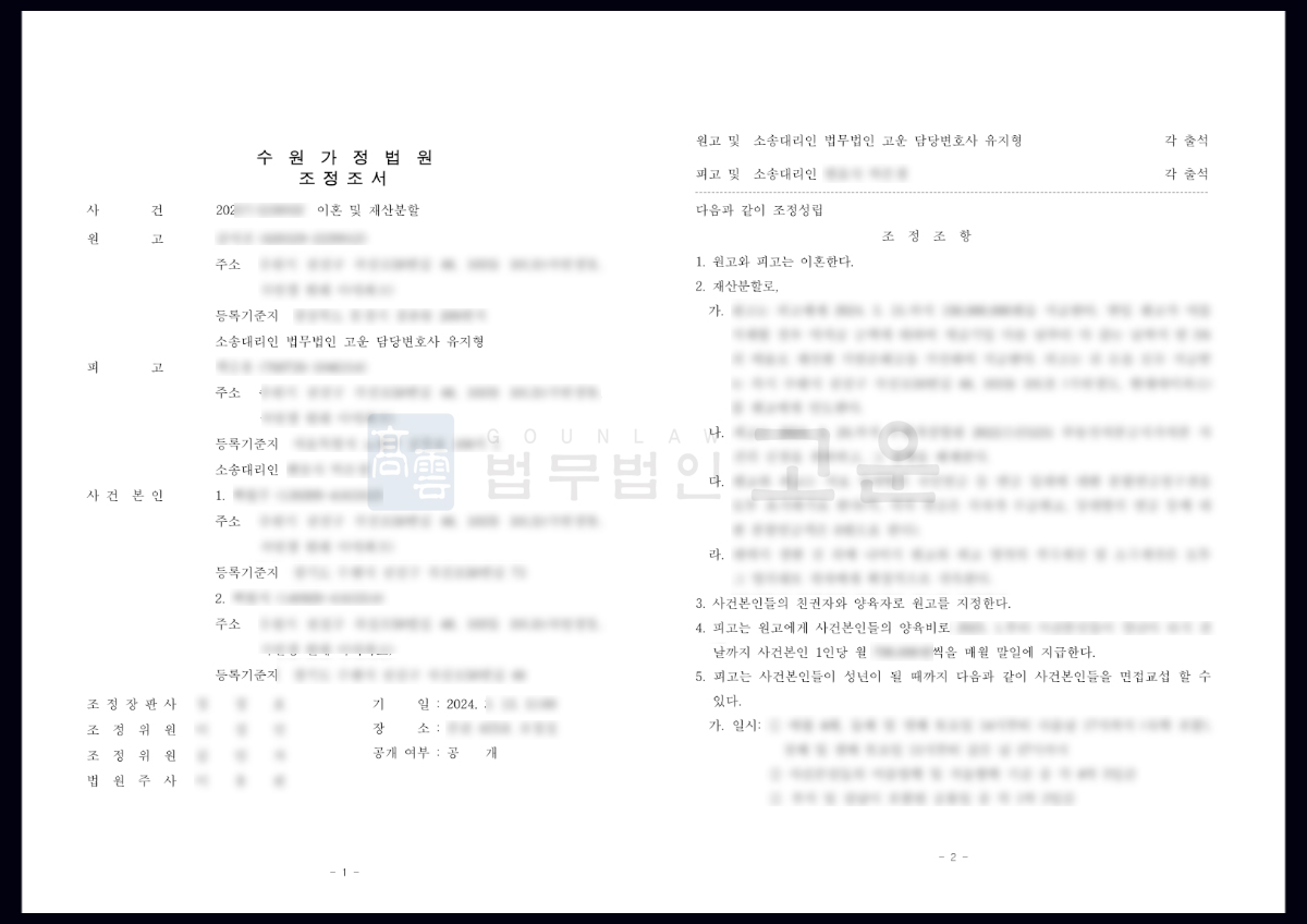 A씨는 배우자 B씨의 무관심과 잦은 가출로 이혼을 결심했지만, 협의 과정에서 B씨가 입장을 번복해 재판을 진행했습니다. 법무법인 고운은 이혼 조정을 신청해 친권·양육권·양육비 및 재산분할안을 제시했고, B씨가 이혼을 거부하자 혼인 파탄과 B씨 귀책을 입증하며 절차 전반을 조력했습니다. 결국 조정에서 A씨가 처음 제시한 조건 그대로 합의가 성립되어 이혼이 마무리됐습니다.