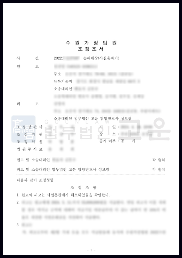 결국 조정 절차에서 위자료를 지급하지 않고 B씨가 청구한 재산분할 금액 중에서도 80% 이상을 감액한 금액만을 지급하는 것으로 조정이 성립하였습니다. 재산분할에 관한 다툼이 많아 1차로 진행했던 조정기일에서는 조정이 성립되지 않고 긴 기간에 걸쳐 소송이 진행되었으나, 결과적으로 의뢰인에게 유리하고 만족스러운 결과로 마무리되어 의미가 있던 사건이었습니다.