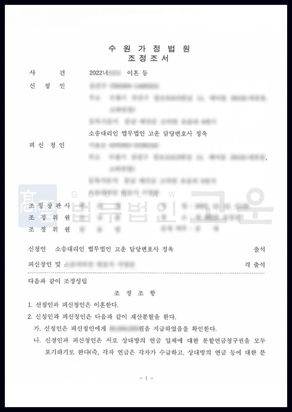 결국 조정절차를 통해 B씨의 귀책으로 인해 혼인 생활이 파탄이 났음이 인정되었고 A씨는 자녀에 대한 친권자 및 양육자로 지정됨은 물론 B씨에게 청구한 양육비와 재산분할금을 100% 인정받았습니다.