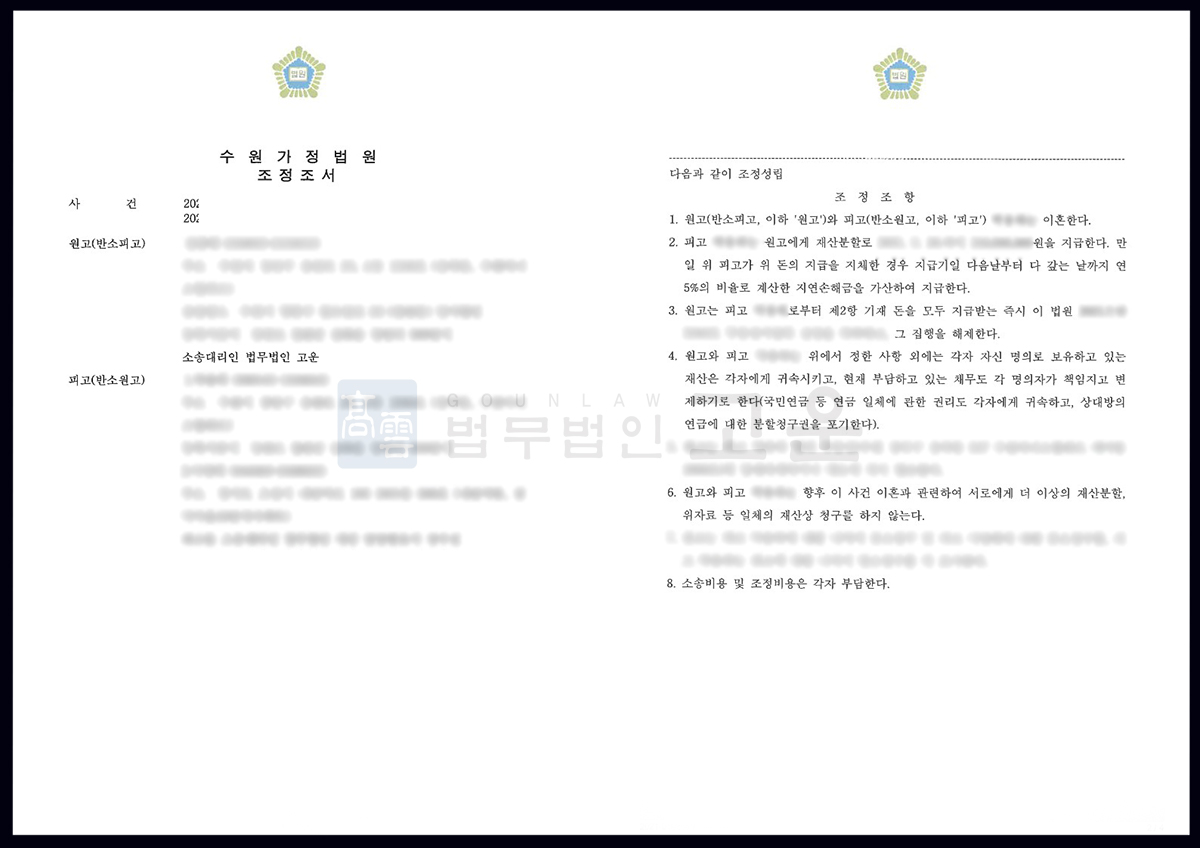 결국 조정절차를 거쳐 법무법인 고운의 주장이 모두 인정되었고, A씨가 처음 원한 것보다 더 높은 비율의 재산분할금을 받는 것은 물론 B씨의 위자료 등 각종 청구 역시 모두 인정되지 않는 방향으로 조정이 성립하였습니다.