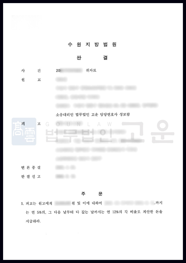 입증자료가 다소 부족한 상황이었지만, 재판부는 법무법인 고운의 주장이 설득력 있다고 인정하며, 고운의 주장을 모두 받아들여 B씨로 하여금 위자료를 지급하는 것은 물론, 지연이자 역시 지급하라는 판결을 내렸습니다.
