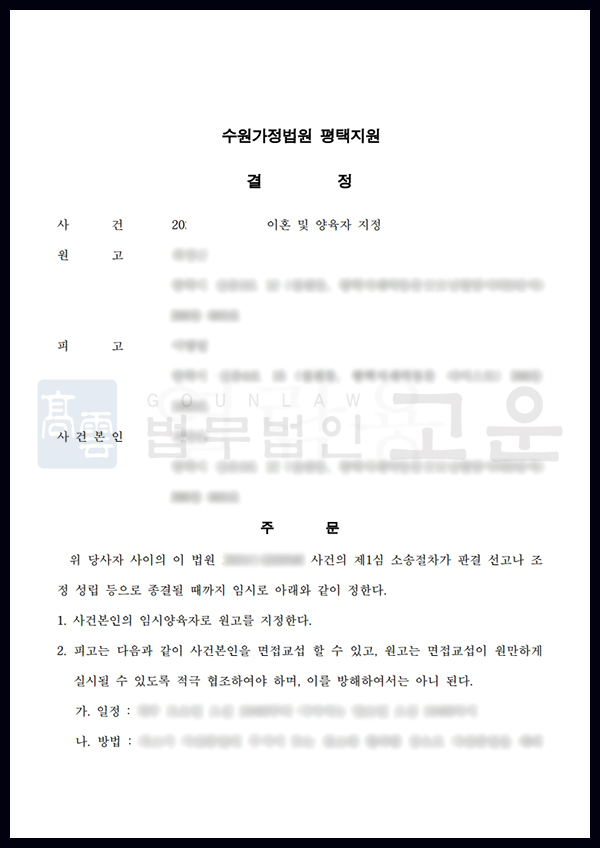 재판부는 고운의 주장을 받아들였고, 이혼 소송 종결까지 A를 자녀의 임시양육자로 지정하였습니다. 해당 결과로 B는 정해진 날짜와 시간에 A와 협의한 장소에서만 자녀에 대한 면접교섭이 가능하게 되었고, 멋대로 A의 집을 드나들 수 없게 되었습니다.