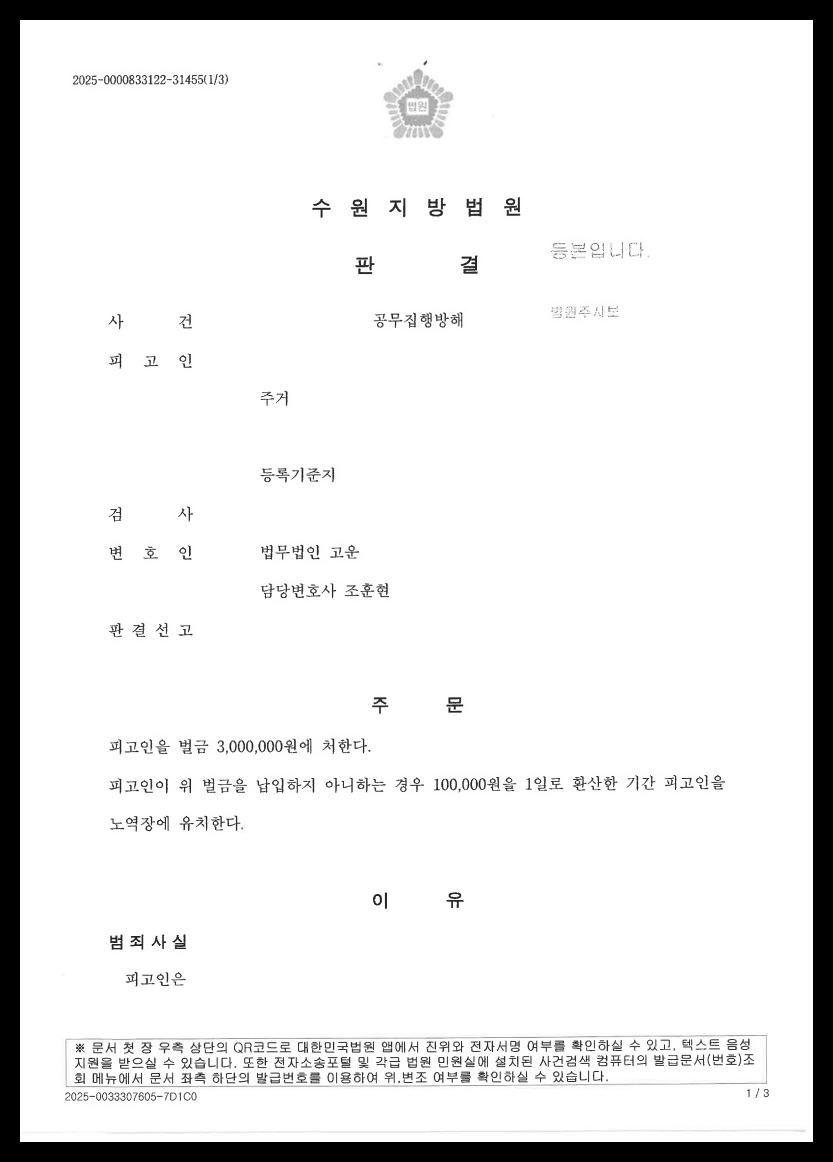 아울러 의뢰인은 피해 경찰관에게 진심으로 사죄하였고, 형사공탁금 100만 원을 납입하는 등 피해 회복을 위해 최선을 다하였습니다. 법무법인 고운은 이러한 사정을 충실히 정리해 재판부에 전달했습니다.