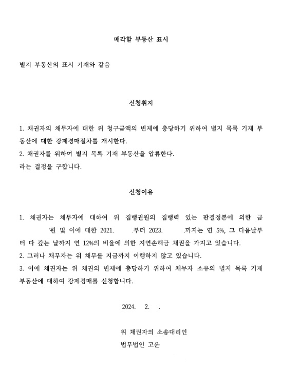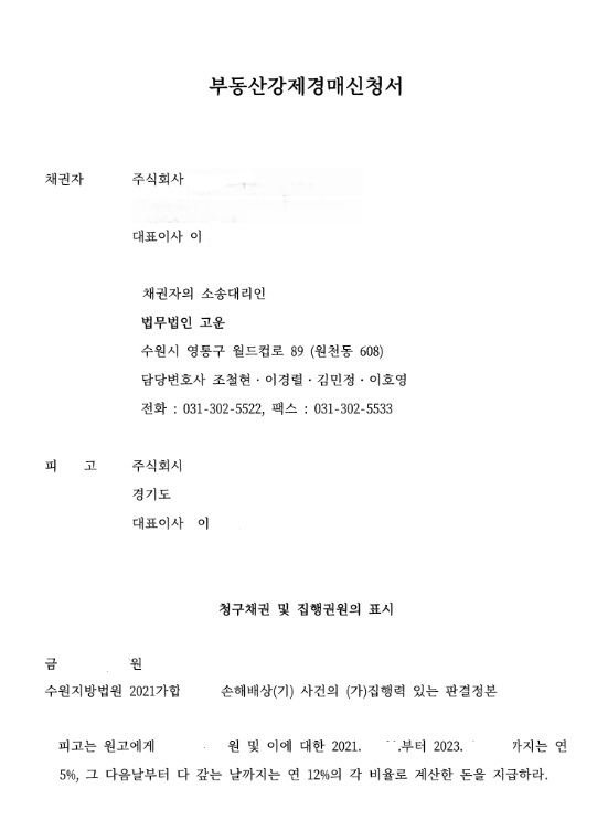 (위 부동산강제경매신청 사건은 실제로 법무법인 고운에서 진행한 사건입니다)