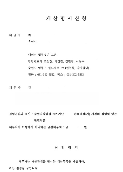 (위 재산명시신청 사건은 실제로 법무법인 고운에서 진행한 사건입니다)