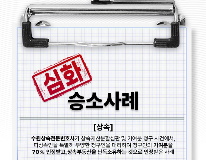 수원상속전문변호사가 상속재산분할심판 및 기여분 청구 사건에서, 피상속인을 특별히 부양한 청구인을 대리하여 청구인의 기여분을 70% 인정받고, 상속부동산을 단독소유하는 것으로 인정받은 사례