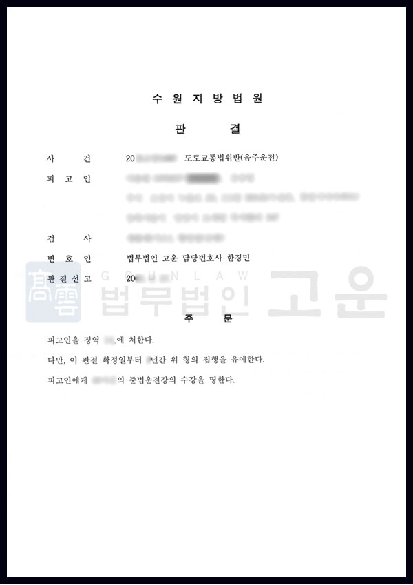 이번 사례는 실형가능성이 매우 높은 음주운전 사건에서도 전략적인 변론을 통해 집행유예를 이끌어낼 수 있다는 점을 보여줍니다. 법무법인 고운은 앞으로도 의뢰인의 상황을 면밀히 살펴 최선의 결과를 만들어 나가겠습니다.