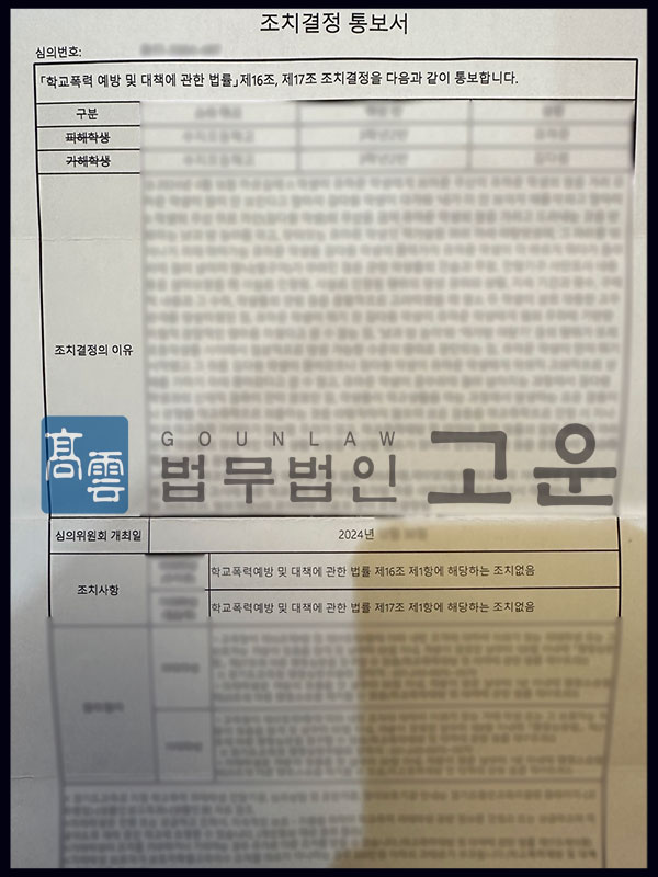 해당 사건은 심지어 피해를 주장하는 학생이 큰 상해를 입어 A가 가해 학생으로 징계 조치를 받을 가능성이 높았습니다. 하지만 고운의 적극적인 초기 대응과, 비슷한 사례의 판례 및 기타 증거에 입각한 의견서 제출 및 변론으로 학폭행위 자체가 없는 것으로 마무리되어 의미가 있는 사건이었습니다.
