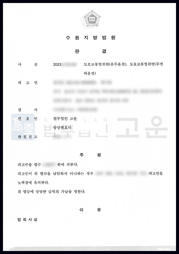 실제로 동종전과가 있고, 무면허에 음주운전을 한 상황이라 중한 형을 받을 가능성이 상당히 높은 상황이었습니다. 하지만 고운의 적극적인 변론을 통해 소액의 벌금형으로 처벌을 낮출 수 있어 의미가 있는 사건이었습니다.