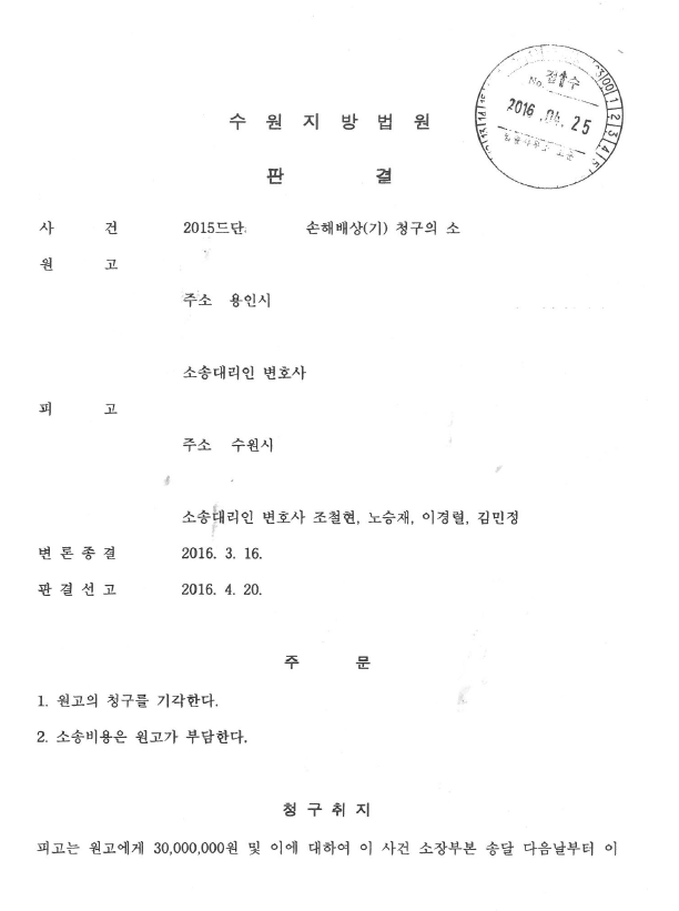 법무법인 고운은 피고를 대리하여 소송을 진행하였고, 원고 주장의 부당성을 끈질기게 주장하여, 결국 피고 전부승소(원고청구 전부기각) 판결을 이끌어냈습니다.