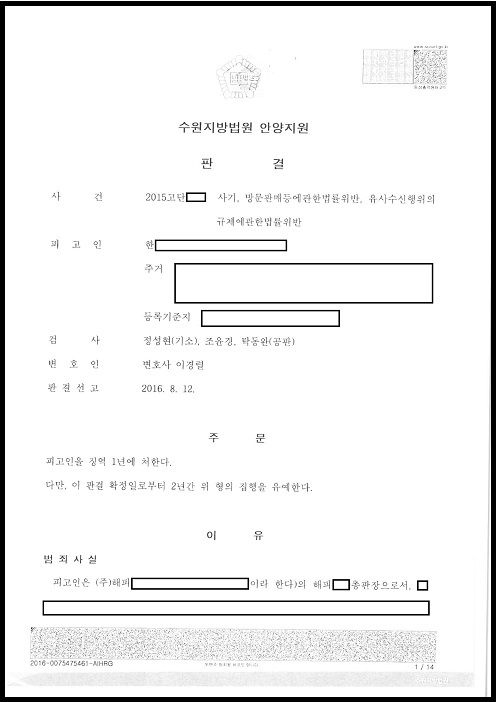 저희 법무법인 고운은 여러번의 서면제출과 증인신문 등을 통해, 피고인이 다단계판매조직의 중간관리자에 불과함을 잘 소명하였고 결국 집행유예의 판결을 이끌어낼 수 있었습니다.