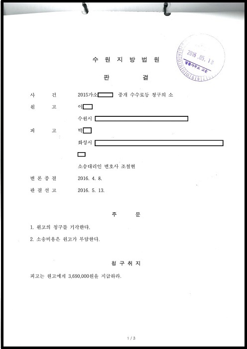 원고는 제대로 중개업무를 이행하지 않았음에도 피고들의 몇가지 실수들을 증거로 하여 중개수수료를 과다하게 청구한 것으로 보였고,