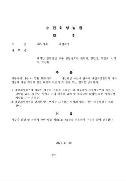 실제로 수원회생법원에 개인회생을 신청한 다음날 바로 금지명령 결정문을 수령하였습니다.