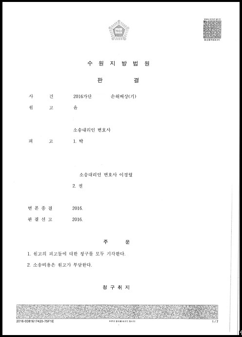 재판과정에서 증인이 피고에게 상당히 불리한 증언을 하였고 피고들 사이에서도 이해관계가 대립되는 등 여러 불리한 사정이 있음에도 불구하고, 법무법인 고운은 피고와 원고의 계약내용과 업무의 범위를 근거로 원고의 청구가 부당함을 주장했고, 그 결과 피고 전부승소 판결을 이끌어냈습니다.