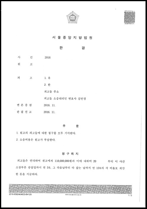 피고 부부는 2007년 경에 빌린 1억 1,000만원을 갚으라는 내용의 대여금 소송을 당하여 법무법인 고운에 소송을 의뢰하였습니다.