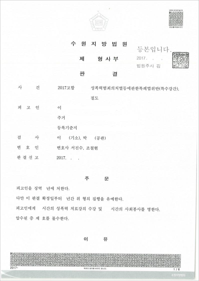 1심 재판부에서도 피고인의 범죄행위에 대하여 그 죄질이 상당히 좋지 않다고 보았으나, 본 법무법인 고운이 피고인에게 유리한 정상들을 부각시킴으로써 집행유예를 받을 수 있었습니다.