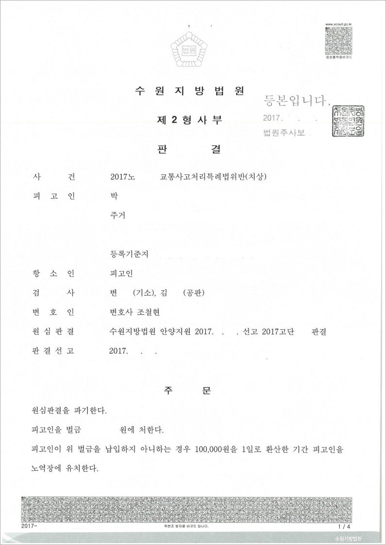 자유형(금고, 징역 등)을 선고 받았습니다. 당시 1심에서는 명백한 교통법규 위반인데다, 피해자들의 상해 정도가 중하다는 등의 이유로 벌금형보다 중한 형인 자유형이 선고 되었습니다.