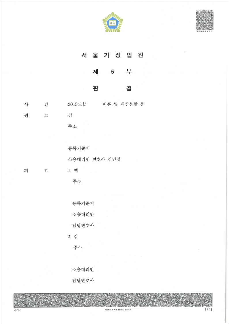 결과적으로 저희 법무법인 고운에서는 모든 청구 부분에 대하여 적극적으로 입증하였고, 결국 피고들의 귀책사유에 따른 위자료를 인정받았고, 원고 측에서 정리한 재산분할내역표에 따른 재산분할을 받았으며, 친권자 및 양육자로 원고가 지정되고, 과거양육비 및 장래양육비를 인정받는 등 모든 부분에 대하여 원고가 청구한 내용에 가까운 판결을 이끌어 내었습니다.