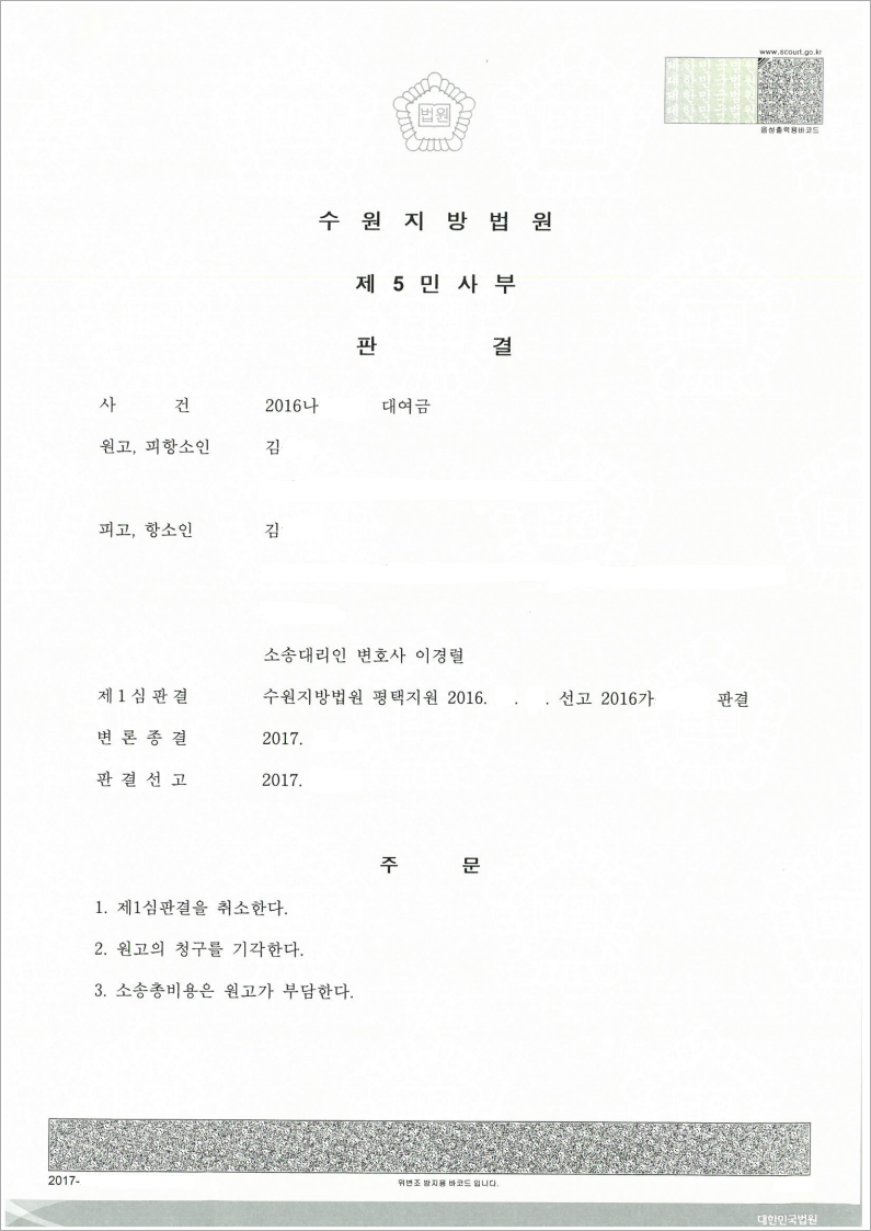 그 결과 법무법인 고운은 1심 판결을 뒤집는 피고 승소판결(‘제1심 판결을 취소한다. 원고의 청구를 기각한다.’)을 이끌어냈습니다.