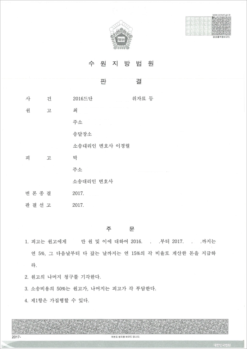 그러나 저희 법무법인 고운에서는 청구 부분에 대하여 적극적으로 입증하였고, 결국 동성간의 부정행위가 인정되어 위자료를 지급받는 판결을 이끌어 내었습니다.