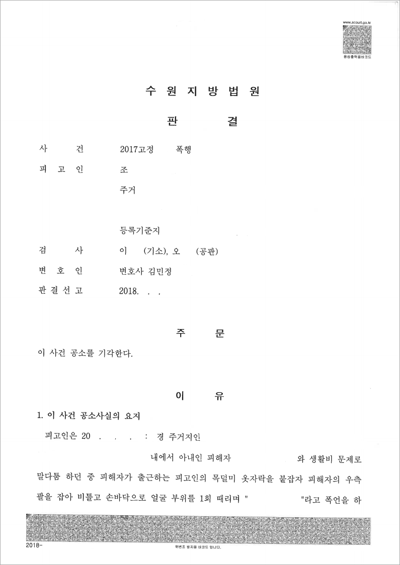 저희 법무법인 고운은 피고인의 입장에서 적극적으로 재판에 임하였고, 합의서 작성경위와 피고인에게 유리한 진술, 증인신문을 진행하였으며, 합의서 부분에 대하여 재판부로부터 처벌불원의사를 진정하게 표시 되었다고 인정받아 결국 피고인에 대하여 공소기각 판결을 이끌어 내었습니다.