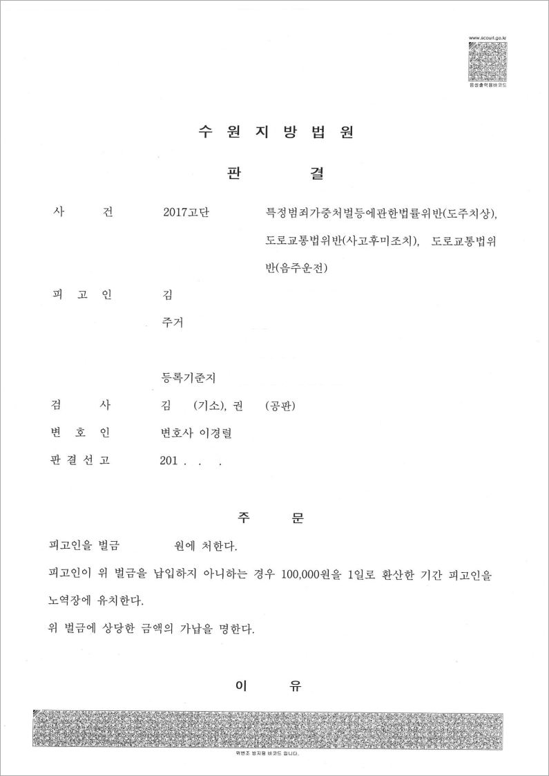 이에 피고인의 가족이 저희 법무법인 고운의 위 사건을 의뢰하였으나, 당시 합의가 되지 않은 상태와 음주뺑소니로 피고인에게 상당히 불리한 사정으로 변론이 쉽지 않은 상태였습니다.