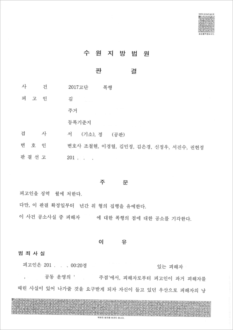 당시 피고인은 피해자들과 합의가 안된 상태이며, 동종 폭행전과가 수차례 있어 피고인에게 있어서 매우 불리한 사안이었고, 실형이 유력한 상황이었습니다.