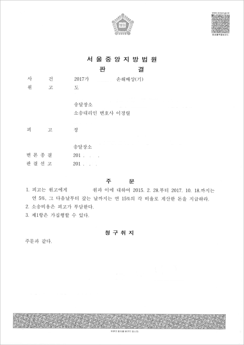 법률사무소 고운은 피고의 불법행위 사실에 대한 광범위 한 자료들을 모두 입수하고 이를 재판부에 입증 및 변론한 결과 손해배상 청구 금액을 전부 인정 받아, 승소 판결을 얻게 되었습니다..