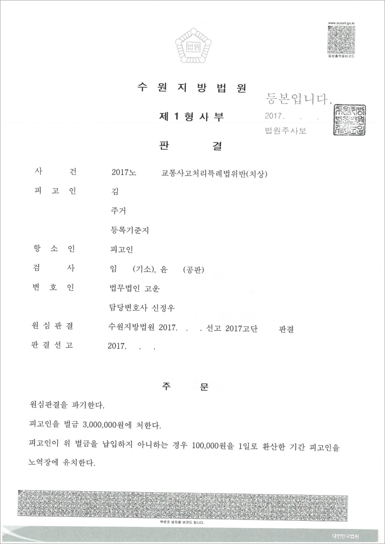 저희 법무법인 고운은 피고인의 입장에서 이 사건 사고가 고의로 발생한 것이 아니라는 점과 사고경위에 참작할만한 사정을 변론하고, 피고인 가정의 생계를 책임지고 있는 사실과 직장을 상실할 가능성이 있는 점 등을 부각시켜, 결국 1심 판결을 취소하고 벌금 300만원으로 최상의 결과를 얻을 수 있었습니다.