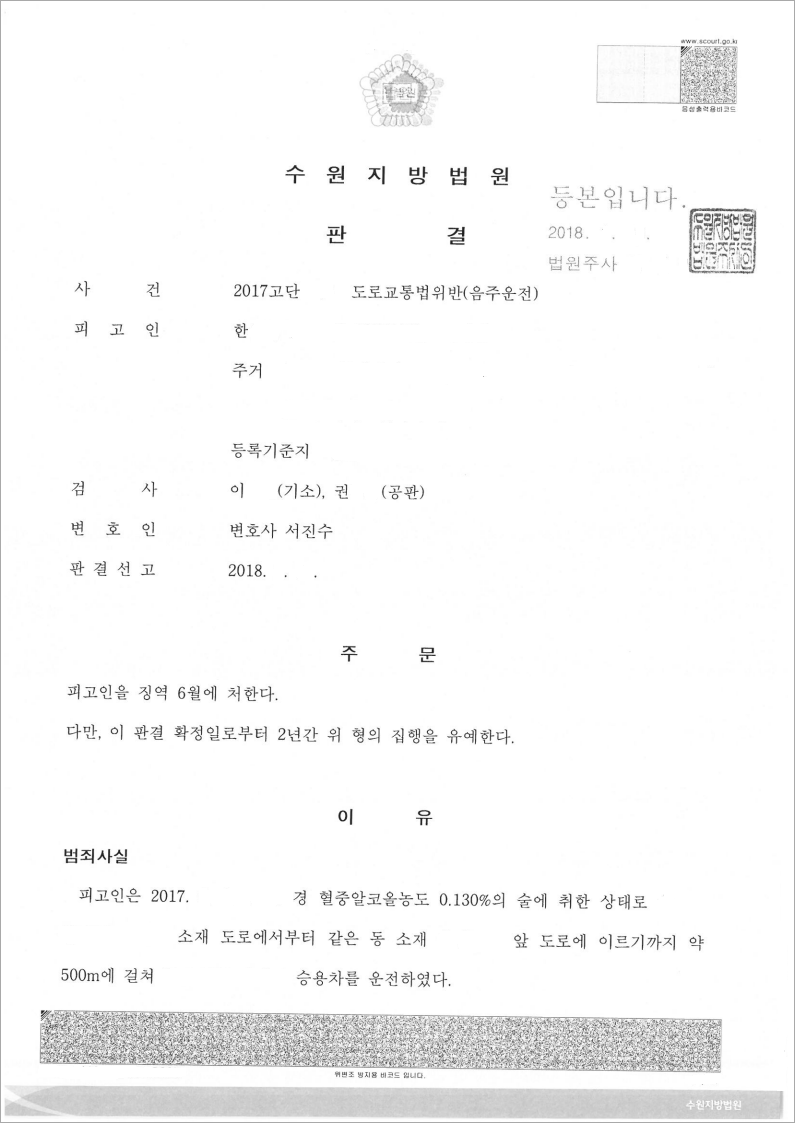 저희 법무법인 고운은 피고인이 사건 당일 술을 마시고 운전을 한 것은 잘못이나, 음주운전에 이르게 된 경위에 참작할만한 사정 등 재판부가 음주사건에서 중점적으로 염두하는 부분에 대해 적극 변론하여, 결국 집행유예의 좋을 결과를 얻을 수 있었습니다.