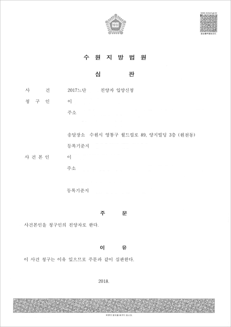 그 결과 친양자입양신청이 받아들여지게 되었고, 자녀는 새아버지의 자녀로 등록되게 되었습니다.