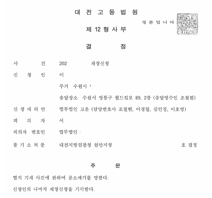 검찰 역시 혐의점을 발견하지 못하였으나, 고운 변호사들은 검찰항고를 거쳐 법원에 재정신청을 하였습니다.