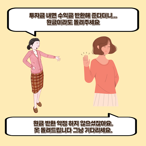 투자금은 애초에 원금 반환의 약정이 없는 데다가, 지인관계를 이용하여 명확한 약정도 없는 경우는 법적으로 이렇다 할 조치를 취하기 어렵고, 고소를 하더라도 수사가 시작조차 되기 어려운 게 사실입니다.