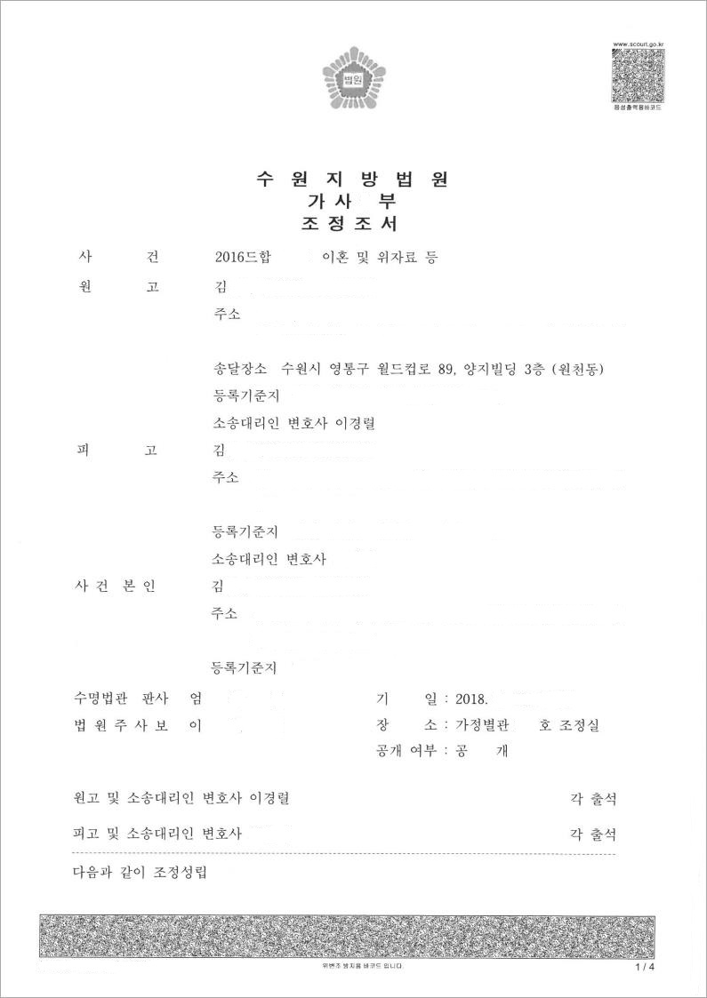 법무법인 고운은 의뢰인에 대한 적극적인 변론과 객관적인 입증을 통하여 재판부를 설득했고, 결국, '원고가 피고로 부터 위자료를 포함하여 재산분할로 5,400만원을 지급받고, 4억원이 넘는 아파트의 1/2 지분을 이전 받으며, 10년간 이 사건 아파트에 무상으로 거주하고, 채무는 모두 상대방이 부담한다' 는 내용의 만족스러운 결과을 이끌어 냈습니다.