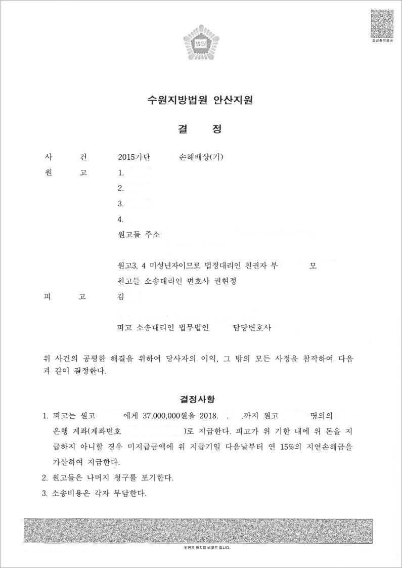 결국 재판부로부터 청구부분에 대한 주장사실을 대부분 인정받아으며, 금액도 최초에 의뢰인이 받기를 희망하며 청구했던 약 2,000만 원보다 두배 가까이 더 많은 금액인 3,700만 원을 실제 지급받게 되었습니다.